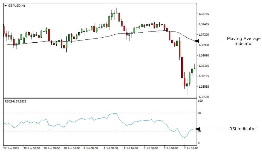 يظهر بعضها كخطوط (مثل المتوسط المتحرك الذي يمتد عبر السعر). بينما يظهر بعضها الآخر في لوحات منفصلة أسفل الرسم البياني، مثل مؤشر القوة النسبية (RSI)، الذي يتذبذب بين القيم العليا والدنيا.