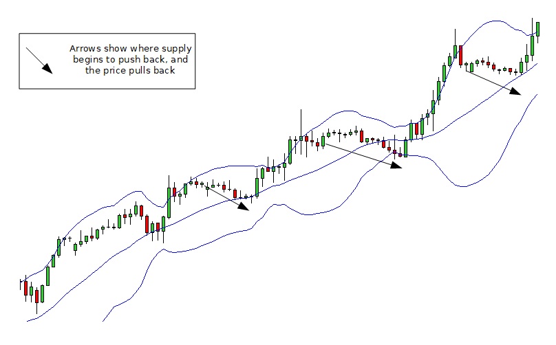 قد يتوقف الارتفاع في نطاق بولينجر العلوي وينعكس حتى في غياب مستوى مقاومة واضح.