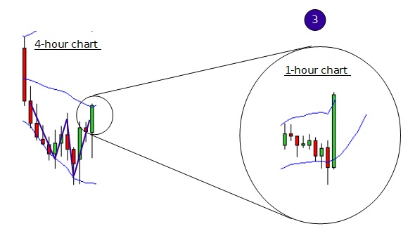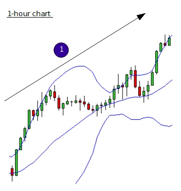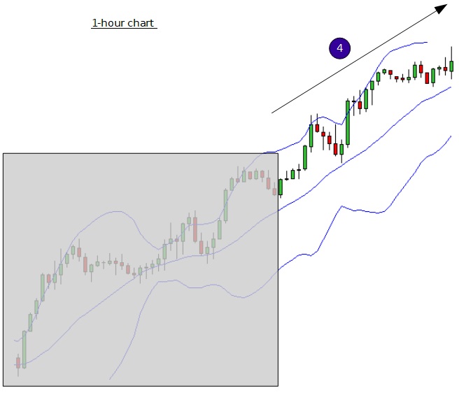 4. ثم يرتفع السعر مرة أخرى على الرسم البياني للساعة الواحدة، مُتماشىً مع الاتجاه العام.