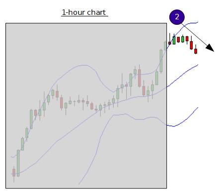 2. يلامس السعر الحد العلوي لمؤشر بولينجر ويتوقف مؤقتًا - يبدو الطلب مُمتدًا، بينما يُقاوم العرض.