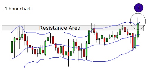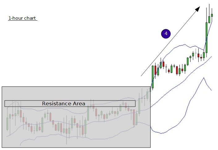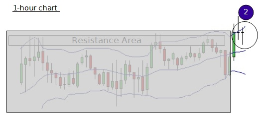 1. على الرسم البياني للساعة الواحدة، يخترق السعر منطقة مقاومة، مما يشير إلى أن الطلب يفوق العرض في تلك المنطقة.