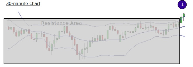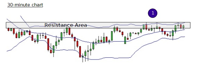 1. على الرسم البياني لمدة ٣٠ دقيقة، يتراوح السعر بين مستوى الدعم ومستوى المقاومة - وهو توازن بين المشترين والبائعين.